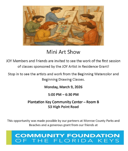 JOY, Inc. (Just Older Youth, Inc.) is a nonprofit organization in the Upper Keys dedicated to creating a community center that expands and improves the life experiences of adults in the Upper Keys. This center provides a venue to develop new friendships and deepen old friendships.